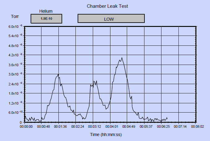 그림 6은 진공챔버에서 헬륨을 사용한 누출 테스트 결과이다. 테스터는 헬륨 탐침을 누출 쪽으로 이동한 다음 누출 지점을 지나 첫 번째 피크를 발생시킨다. 누출 위치가 제한되면 검사자는 다시 돌아가서 누출 위치를 정확히 파악한다. 대부분의 상황에서 누출 테스트는 간단하며 전통적인 방법과 다르지 않다. 다음 절에서는 전통적인 방법들이 실패하는 몇 가지 상황에 대해 논의하며, RGA가 어떻게 더 나은 방법을 제공하는지를 보여준다.