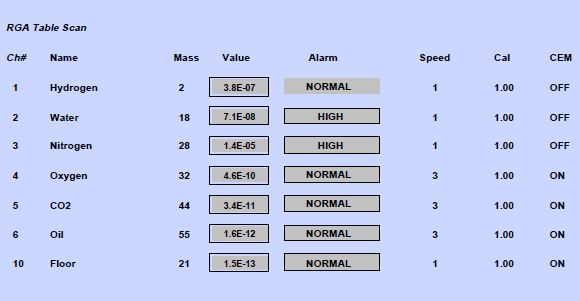 이와 같은 데이터는 세정 절차 개발에 매우 중요하다. TCE가 오일을 성공적으로 제거하는 동안 진공 챔버는 세정하지 않았을 때도 다 더 오염된 상태로 남아있었다. 질량 스펙트럼은 배기 시간 및 기본 압력보다 세정 절차에 대한 보다 정확한 평가를 제공한다. 시스템이 빠르게 펌프 다운된다고 해서 바람직하지 않은 오염 물질이 존재하지 않는다는 보장은 없다. 넓은 다이나믹 레인지는 또한 평가를 더 빨리 할 수 있게 한다. 사용자는 시스템이 오염되었는지 확인하기 위해 물이 배기될 때 까지 몇 시간을 기다릴 필요가 없다. RGA는 높은 물 분압이 있는 상태에서도 측정할 수 있다.