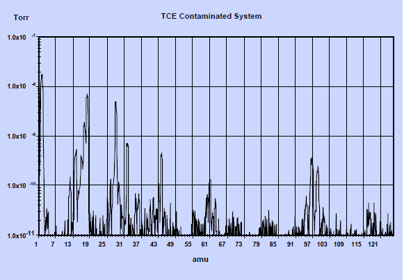 오일 오염은 진공 시스템에서 일반적이다. 솔벤트로 부품을 세정하는 것은 이러한 오염을 제거하는 일반적인 방법이다. 하지만 아세톤 및 TCE와 같은 유기 용제가 오히려 제거하려는 오일보다 더 강한 오염 물질임을 관찰되는 경우가 있다. 그림 3은 97과 99의 주요 피크와 61, 63, 117 및 119의 작은 피크로 표시되는 1,1,1-trichloroethane의 오염을 나타내는 스펙트럼을 보여준다. 쌍을 이루는 피크는 35Cl과 37Cl(75%, 25%)의 자연 동위원소 발생에 의해 발생한다. 이 스펙트럼은 용매와의 최초 접촉 후 1 주일 후에 측정되었다. TCE는 세정 단계 동안 시스템의 O- 링으로 스며들었으며 2주 동안 O- 링에서 계속 가스를 배출했으며 중단 징후가 보이지 않았다. 결국 부품을 제거하고 오븐에서 구워 결국 TCE를 제거될 수 있었다.