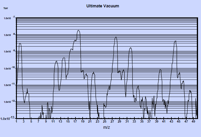 이 스캔 (1 ~ 50 amu)은 진공 챔버에 일반적으로 존재하는 일부 가스를 보여준다. 피크는 많지만 주로 7 종으로부터 기인한다. 수소는 2이고 헬륨은 4이다. 물은 O+, HO+ 및 H2O+ 종으로 인해 16, 17 및 18에서 1차 피크를 제공한다. 19와 20의 낮은 피크는 자연적으로 존재하는 0.2 % 의 18O 때문이다. 질소는 28에 있으며 원자 N+와 이중 이온화된 N+에 의해 14에서 피크를 발생시킨다. 산소 분자는 32에서 피크를 나타내고 동위 원소 피크는 34에서 피크를 나타낸다. 아르곤은 40에서 피크를 나타낸다. 이산화탄소는 44에서 피크를 나타내고 CO2++ 및 C+의 피크는 22에서 나타난다. 다른 피크는 이러한 종의 fragments와 오염 물질로 인해 발생된다.
