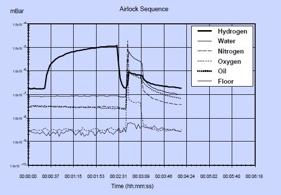 3:09에 로드락과 메인 챔버 사이의 밸브가 닫히고 압력이 기본 값으로 돌아 가기 시작한다. 산소는 챔버 밖으로 펌핑된다. 수소, 물 및 질소는 원래 값을 회복하지만 천천히 회복된다. 오일은 더 높은 농도로 유지되기 때문에 놀라운 것 이다. 이 시퀀스가 여러 번 발생하면 오일이 계속 올라간다. RGA를 사용하면 원하지 않는 값에 도달하기 전에 이를 감지 할 수 있다.