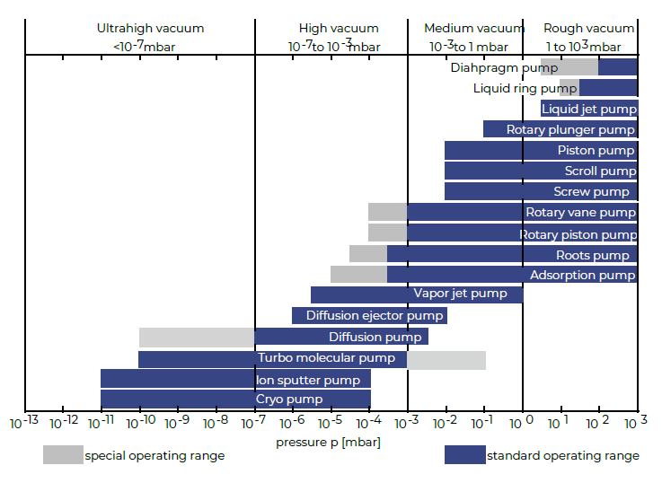 일반적으로 진공기술에서 압력 범위는 다음과 같이 정의된다. 저진공 (10^-3 ~ 1 mbar); 중진공 (1 ~ 10^-3 mbar); 고진공 (10^-3 ~ 10^-7 mbar); 초고진공 (10^-7 ~ 10^-12 mbar); 극초고진공 (10^-12 mbar 이하) (아래 그림 참조)