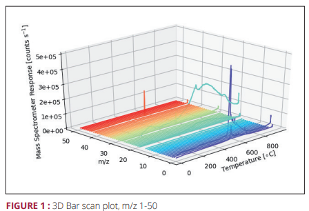 이 예에서는 Al2O3로 코팅된 Si 웨이퍼를 30°C/min의 일정한 속도로 1000°C까지 가열했습니다. 온도 상승 동안 탈착 종을 검출하기 위해 1-50 amu 바 스캔이 수행되었습니다. 분석된 전체 질량 범위는 아래 3D 플롯에 표시되어 있습니다.