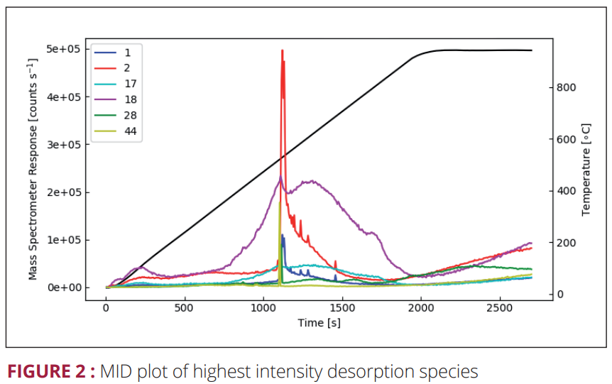 동일한 물질의 새로운 샘플을 사용한 두 번째 TPD 실행에서 관심 있는 탈착 종(여기서 H2, H2O, CO2 물 및 이산화탄소)은 더 높은 시간, 즉 온도 분해능을 산출하는 다중 이온 검출(MID) 스캔을 사용하여 다시 측정되었습니다. 탈착된 관심 종. 결과는 아래 플롯에 표시됩니다.