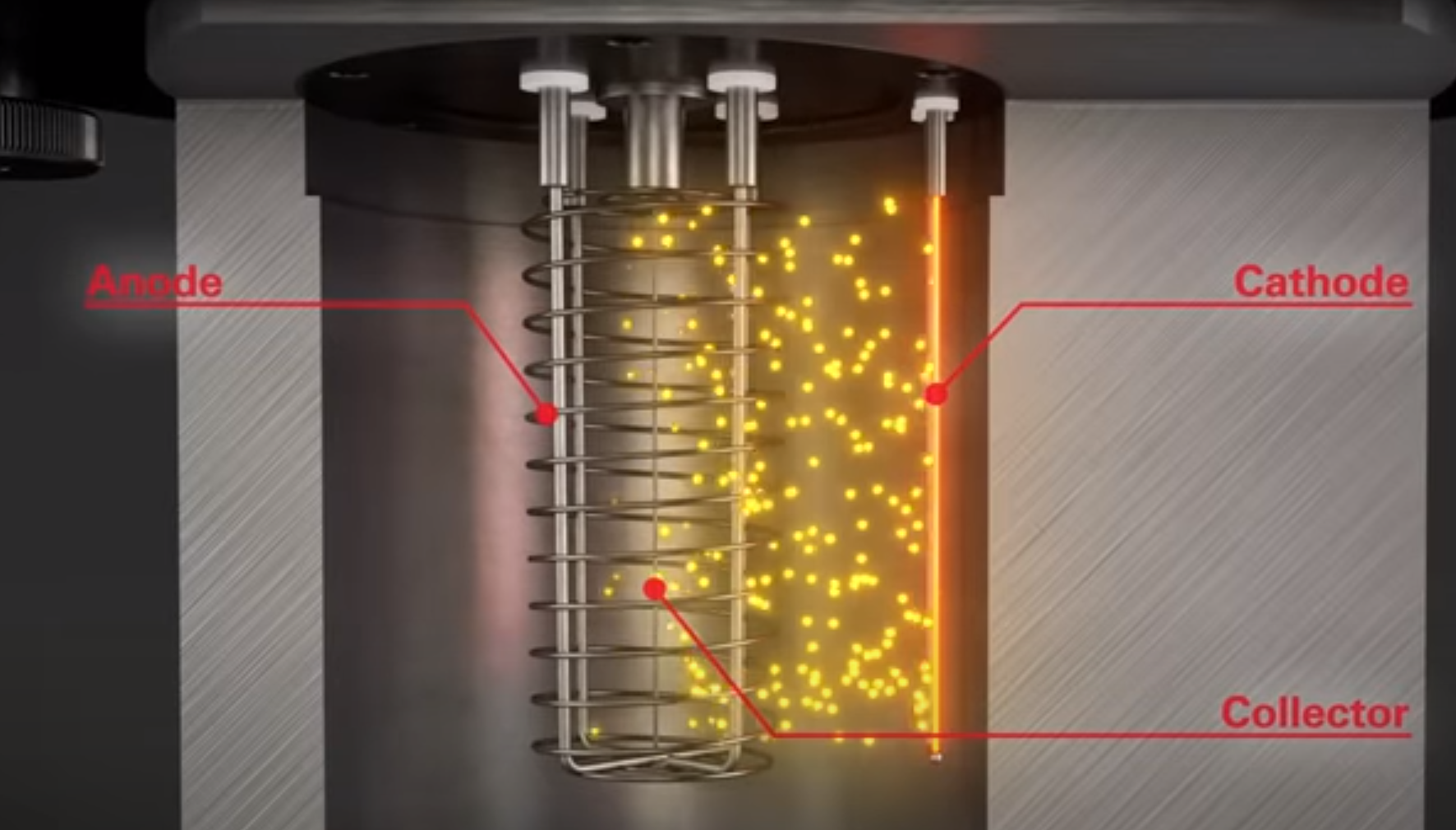 아래 동영상은 열음극 게이지의 작동 원리를 보여 줍니다. 가스 분자가 뜨거운 필라멘트에 의해 어떻게 이온화되는지 볼 수 있습니다.