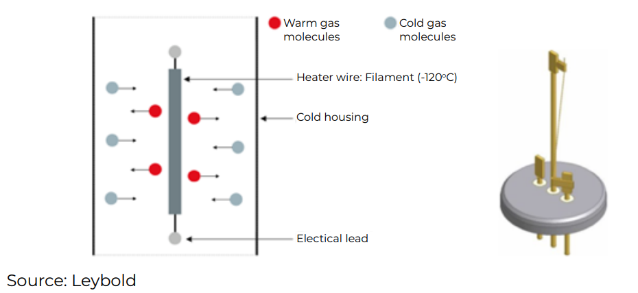 Pirani 또는 열전도도 게이지는 기체의 열전도도를 사용하여 대기압에서 10-4 mbar 범위의 압력을 측정합니다. 게이지 헤드 내의 필라멘트는 휘트스톤 브리지의 한쪽 팔을 형성합니다.